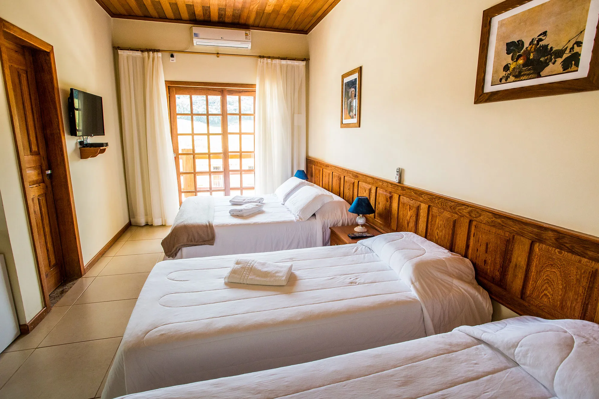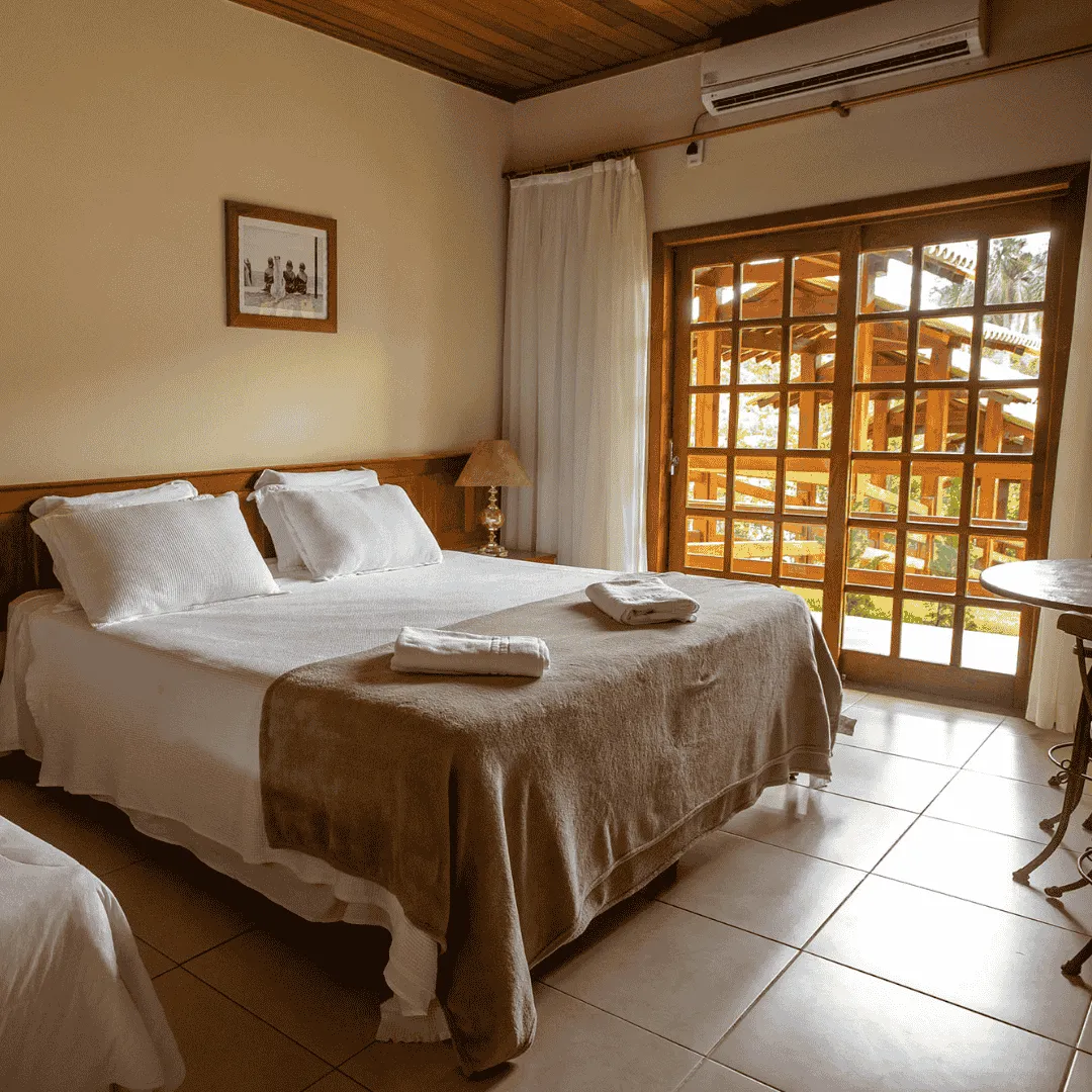 Quarto Aconchegante e Funcional conta com 20m², este quarto possui detalhes em madeira e varanda, oferecendo uma cama casal padrão ou uma cama casal padrão e uma cama de solteiro. Equipado com TV a cabo, frigobar, ar-condicionado (frio/quente), secador de cabelos, telefone, Wifi e ambiente Pet Friendly, garantindo conforto e praticidade para sua estadia.